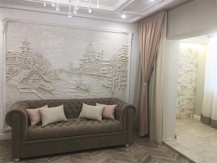 Перечень материалов довольно разнообразен: тут обои и краска, декоративная штукатурка и архитектурные молдинги, на полу ламинат, мозаика и плитка.