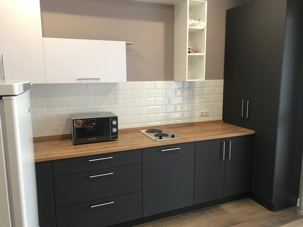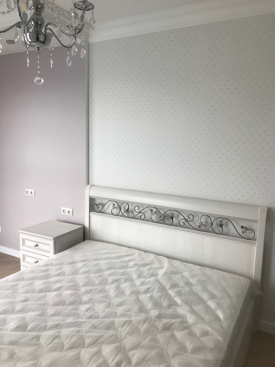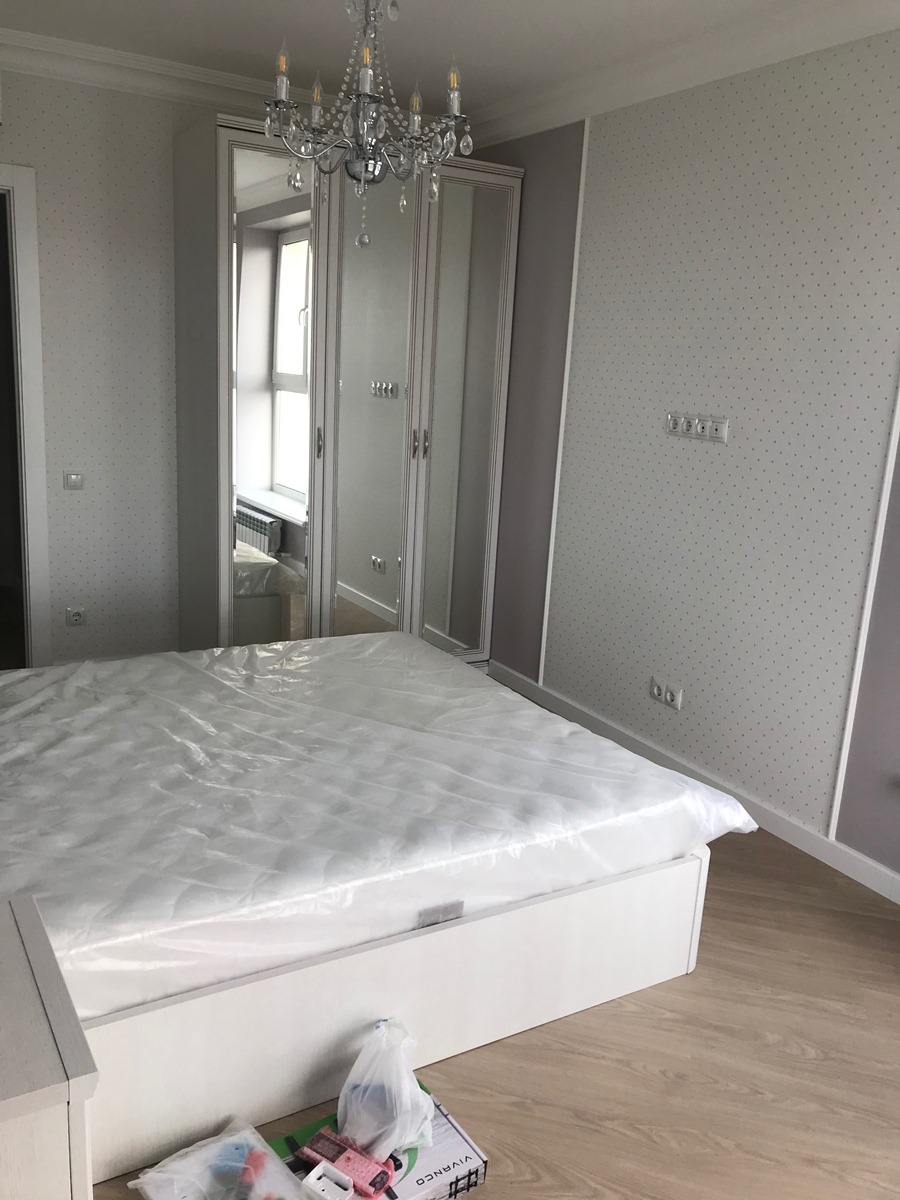 Процесс начался с возведения перегородок (квартира была абсолютно пустая) и закончился сборкой мебели и подключением телевизора с домофоном.